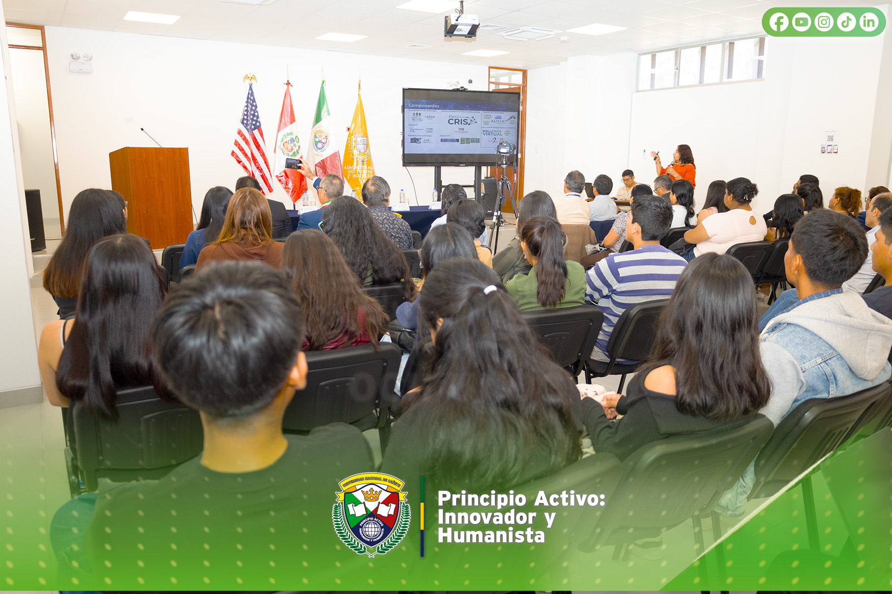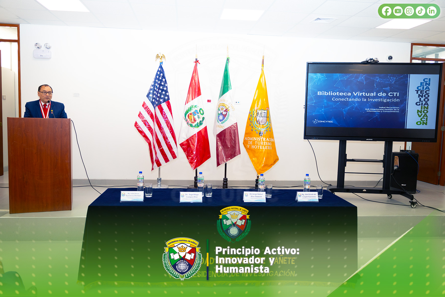 La Vicepresidencia de Investigación de la Universidad Nacional de Cañete, en articulación con CONCYTEC, desarrolló con éxito dos capacitaciones presenciales orientadas a fortalecer las competencias investigativas de su comunidad académica, realizadas en el auditorio de la Escuela Profesional de Administración de Turismo y Hotelería. Ambas actividades contaron con la destacada participación del vicepresidente de Investigación, Dr. Jorge Rafael Díaz Dumont, así como de importantes autoridades universitarias.