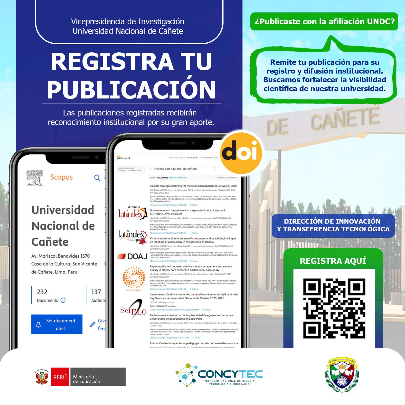 Con el objetivo de fortalecer el posicionamiento académico y la producción intelectual de nuestra comunidad, la Vicepresidencia de Investigación, a través de la Dirección de Innovación y Transferencia Tecnológica, invita a todos los docentes, investigadores y colaboradores que hayan realizado publicaciones científicas bajo la filiación de la Universidad Nacional de Cañete (UNDC) a registrar sus trabajos en nuestra base de datos institucional.